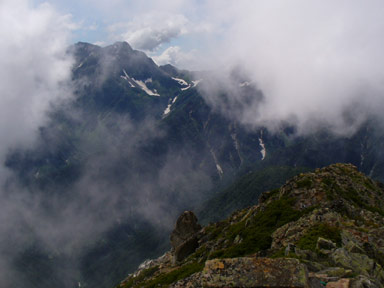 山頂はガスでしたが、たまにうっすら晴れると迫力の峰が顔を出します。