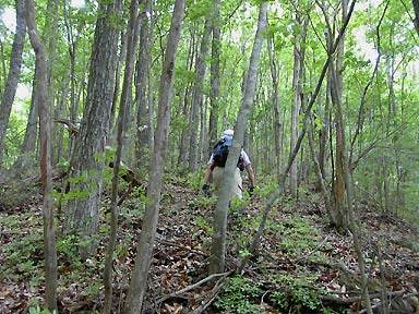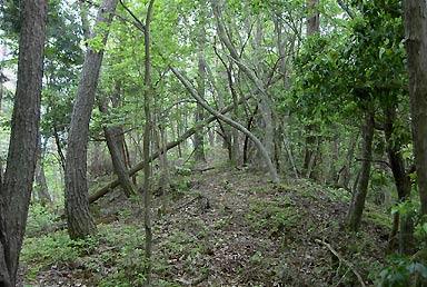 南面へ古い道が明瞭に下っている。どちらにするか迷うが東へ。しばらくつづら折れの後、水平に近い