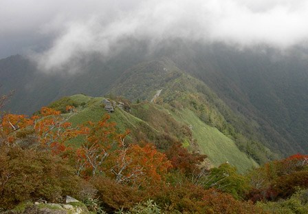 帰路はゆっくり道を踏みしめ花や紅葉しかけの山道、ガスの流れる尾根を眺めて行く。
