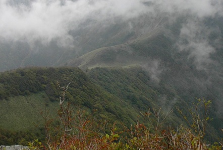 尾根から幽玄の寒風山 (山頂は雲の中)