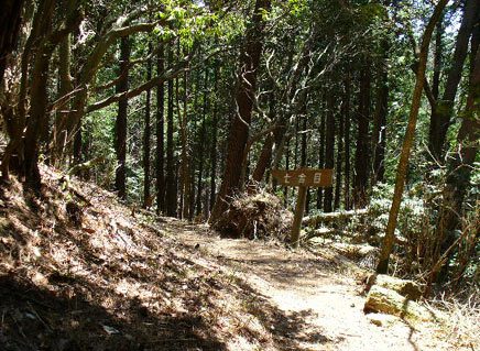 もとの道に戻って三合目のベンチを過ぎ、尾根を乗り越す。細い道だがほぼ平坦。雑木林がまた植林に