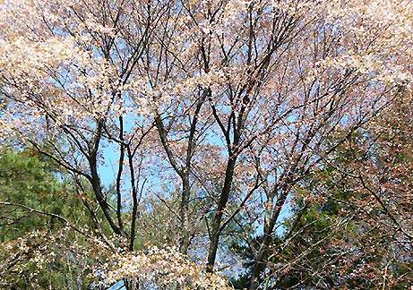 ひょっこりと残っていた。青空をバックに大きな山桜が枝を広げて満開。その下にアシビも満開。地面は落ち葉。
