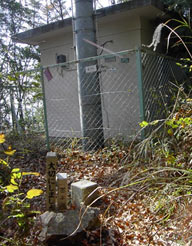 その脇から雑木林に分け入り山頂へ。コンクリートの小屋のような施設の脇に三角点が