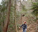 時折倒木がある植林地を沢伝いに、単調な登りが続く。小金口から約40分、植林終