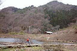 公園に着く。山水が流れ込む透き通った池の上に桟橋状の遊歩道がある。水辺には