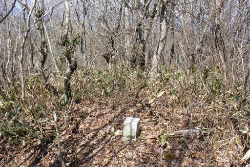 再び植林となり群れてきたササにポツリと雪。ピークは杉とササで覆われているのみ展望なし。
