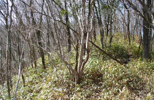 行くには行けるのだが、斜面は雑木の下が一面のササである。先の尾根にも良い感じの雑木の樹冠が