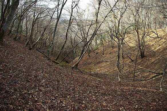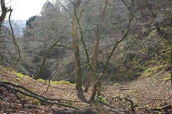 寺山峠は広い峠で植林から雑木に変わる。低い陽射しが落ち葉を照らす。