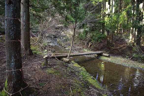 さらに何度も沢を渡って下ると二ノ谷出合。できたばかりのような林道が横切る。林道が上りになる頃、