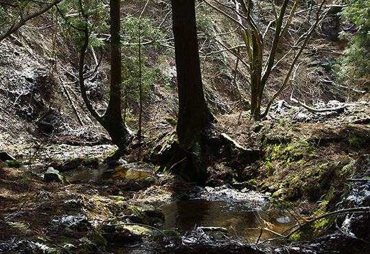 緩い上りの林道がピークになる頃にその谷が現れる。うーん、ここは良い感じが残っている。陽射しも出たり隠れたり。