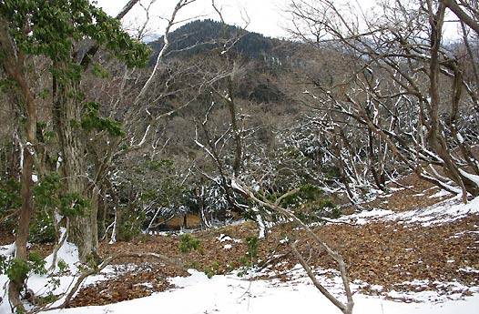 雪の斜面を下りていくと、いきなりいい谷が西の竹次谷の方に下りていた。北側が雪、南向きは落ち葉。