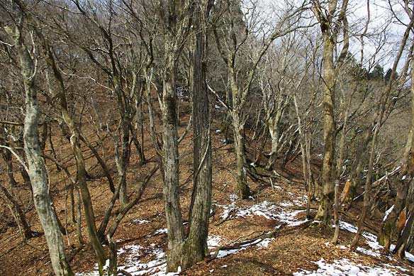 寒々とした雪の尾根。それでもくるぶし程度。開放的な落葉樹林ではない。二つめのピークで引き返す。