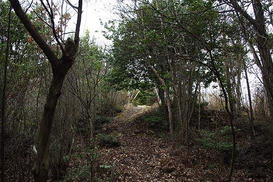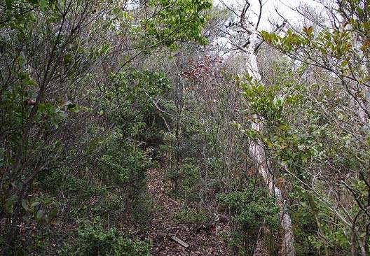 小さな森といえどもうるさい低木ヤブの鞍部から東へ登り返すと尾根に乗り、明瞭な細い山道が南北に認められる。