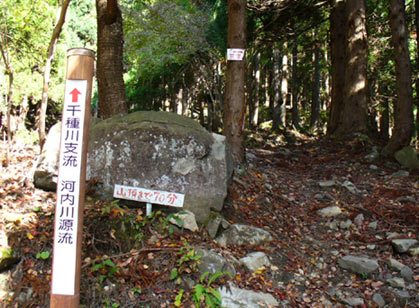 終点にはオフロード車が一台。源流の標柱と「山頂まで70分」の道標。これがうわさのやつかぁ、
