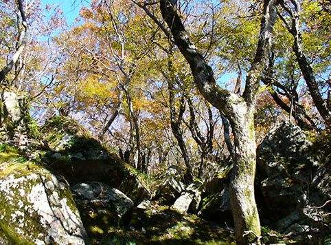 大岩の庭園で風景を楽しみ植林へと入る。途中にも展望の開ける斜面や紅葉の綺麗な木々がある。