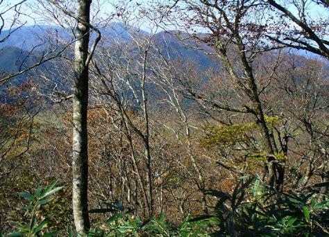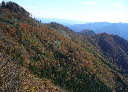 少しずつ高度は上がり南東尾根の紅葉が見え隠れする。さらに登れば後山が植林の上に顔を出す。