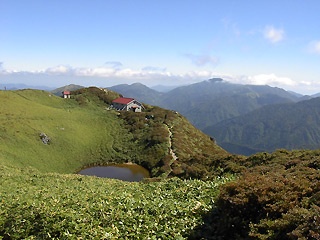 【展望】 ひと登りで池のある笹原に出る。雲上の楽園。右にヒュッテ、左に三嶺山頂。その間を