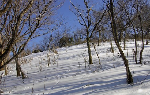 逸れてみる。少し深くなった雪に獣の足跡のみが付いている。谷のすり鉢の縁に着いた頃には緩い