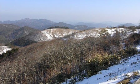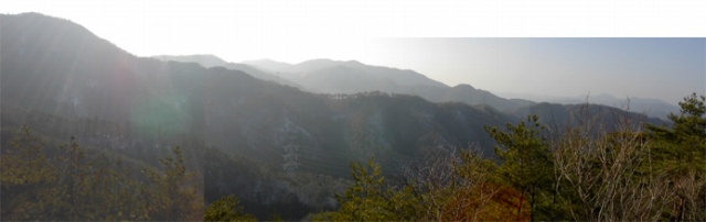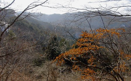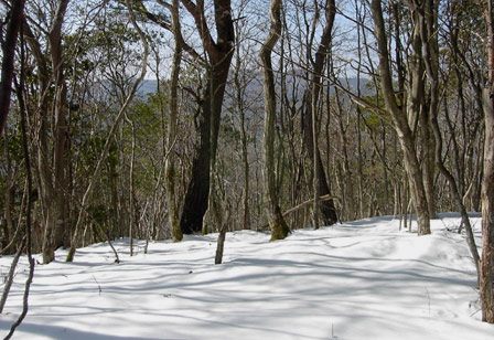 一息ついた所で尾根をさらに北へ。しばらくは低い雑木林。冬枯れの枝の間から山影がみえる。