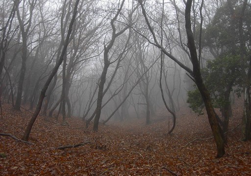 山中に自分一人かと思うと、白い靄にたたずむ木々も神々しいものである。5mはあろうかという高さの