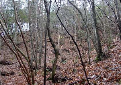 程よく湿った落ち葉は滑らず登りやすい。鉄塔の唸りが頭上で聞こえた。意外と急な斜面だが