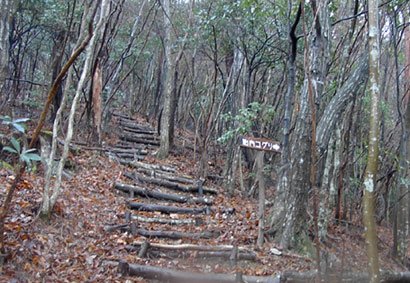 散策路を右に分かれて少し細くなった尾根道を登る。さらに細くなり、急な登り。素朴な木の階段が急になる。