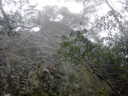 思わせる岩の尾根。苔むした岩が雨に濡れ霧にまかれて怪しげな雰囲気が漂う。まだ出てこない。静かな