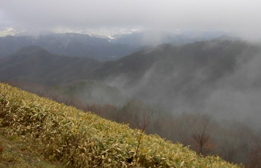 ポッコリ現れる。天王から北尾根の方もガスが動くと冬枯れの絨毯。