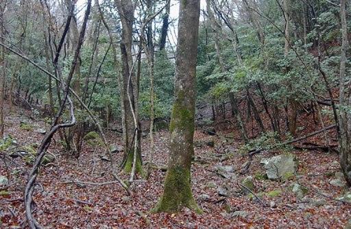 谷の歩道を庫阪峠へ向いて歩いていく。モリアオガエルの池を過ぎて植林の中となる。植林の幹が