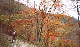 【黄葉の道】 風が冷たいなってきた。南を見上げると薊岳だろうか、誘うように
