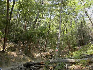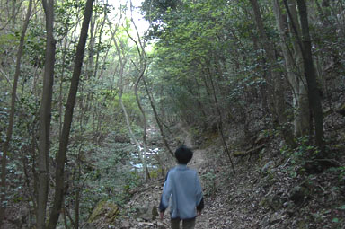 急斜面を下りると谷に出た。尾根より谷の方が涼しげ。沢音を聞きながら長い谷歩き。