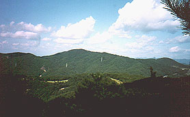 ■目的地:中山(487.2m) <山域:北摂・宝塚市> ■日にち:1997年9月28日(日) ■天気:晴れ ■同行者:俊一 ■コースタイム: 自宅(8:00)=バス・電車=阪急中山駅(8:30)〜中山寺(8:35)〜東尾根〜 天宮塚(10:10)〜奥の院道と合流〜展望台(10:20-10:50)〜 中山桜台分岐〜最高峰(11:00-11:10)〜390m展望地(11:40-12:00)〜 361mピーク手前展望地(12:35-12:50)〜愛宕原分岐〜露岩急坂(13:20)〜 満願寺分岐(13:35)〜阪急山本駅着(14:05) 歩行時間:3時間45分 歩行距離:約13km 【中山】 阪急電鉄主催などのハイキングで、箕面・ポンポン山とともに 北摂で最もポピュラーなコースである。 南斜面は宅地が尾根近くに迫り、北側はゴルフ場。近所の知り合いが 「中山は死んだ山だ。」と言っていたのが印象に残っていて、足が向かなかった。 近場でそこそこ歩き堪えがあり、俊一も行くのでそれなりに整備されたコース ということで重い腰を上げた。 この結果、食わず嫌いが直りました。(^^;; 【中山寺】 ご存じの方も多いと思いますが、中山寺は安産の神様として 有名です。(お寺なのに神様?) 我が家も3回お参りに行きました。 駅から左手の短い参道を行くと大きな山門。ここをくぐって石段を登り 左手の信徒会館の方から、奥の院に向かう道が明るい墓地の中に伸びる。 信徒会館では晴天の下、西に六甲の眺めが良い。10名ほどのおじさん グループが休憩中。ここまではお参りの時に来たことがあるが、この先は 不案内。道脇の案内板で確認して進む。 【東尾根】 ハイカーの多い奥の院コースを避けて東尾根コースに取り付く。 シンボル広場方面を見送り、沢の右(登山用語では左岸と言うのですかね)を登る。 こちらは静かすぎて時折ササが生い茂る心細い道である。程なく道標が現れ、 山頂まで約2.7kmとある。ゆっくりとした登りが続く。まばゆい青空の広がる 露地と松の多い林の日陰道、そしてササやカヤ・シダが覆い被さる道が交互に現れる。 右手は木々の向こうに住宅が見え隠れする。山道ではあるが、下界の喧噪から 完全に逃れることは出来ない。が、思ったよりいい雰囲気で、秋の風も心地よい。 道標が3、4回出て来る。最初は人の気配がなかったが、登るにつれハイカーや 散歩風の人と出会う。比較的長めの登りの後、つづら折りに沢へ下る。 ここで山頂まで約0.7km。沢を渡って登り返すと南に大阪湾が広がり天宮塚に着く。 この辺りは神戸営林署設置のの灰皿まで置いてある。一休みに丁度良い。 【展望台で野鳥とリス】 平坦道から少し登れば奥の院コースとの合流を告げる 道標。ここからすぐに展望台の東屋がある。トレーニングの山男風3人が休憩中。 林の中なので展望なし。さらに先に行くと赤土の崩壊した崖。手摺りが付けられ ているが、切れたところから崖側に入る。裏六甲から大峰山が広がり眼下はゴルフ場。 まだ青々とした緑が広がる。 少し早いがおにぎりを食べながら一服。通り抜ける風が寒いくらいだ。 そこに、白鹿のような若い女性が現れる。直ぐ下の宅地からのランニングのようである。 その後、年輩のグループが多数到着。宝塚野鳥の会。すごい望遠鏡を持った人もいる。 上空で舞う3匹のノスリにどよめきがおこる。 ゆっくり出来そうにないので、ぼちぼち出かける。 少し下りて縦走路に戻ると、前方の林でカサコソと音がする。茶色のふさふさした 尾を踊らせながらリスが木を渡っていく。俊一とじっくり眺めることができた。 写真を撮ろうとゆっくり静かにカメラを取り出そうとしたが、すでに奥へ行ってしまった。 今日は、これだけで来た甲斐があったものだ。いつまでも住み着いていてもらいたい。 みなさん、びっくりさせないように、静かに温かく見守って下さい。 【最高峰】 長い登りに俊一が駄々をコネコネし始めた。(^^;; もうそこだからと なだめると、ホントにすぐ山頂である。20人ほどが思い思いにお昼。 三角点は木々に囲まれているが、少し移動すると各方面が見渡せる所がある。 私は北側の北摂の山々が一望できる赤土崖に出て展望写真を撮る。俊一が先を 促すので早々に切り上げる。 【縦走路】 山頂から少し戻るとT字路がある。おじさんに南への道を聞くと 行き止まりで見晴らしもよくないとのこと。左手の道を行く。俊一、ペース ダウン。(ーー;) ここは、ぐっと堪えて歩調を合わせる。 それにしてもこの道、右に緑色の金網柵がずっと続く。そのうち、両側が柵に なる。何とも情けない道である。これさえ無ければ言うことなしの縦走路なん だけどなぁ。 花の種類の少ない山である。ススキとハギ、そしてコシオガマかイヌコウジュ のようなピンクの花が唯一、目を楽しませてくれる。 最高峰を過ぎたら、半分終わった気になってしまいそうだが、甘かった。 その後4回ものアップダウンがあった。なかなかあなどれない。そのせいか、 大きなリュックを担いだトレーニング風の人も多い。 向井山からすぐの390m展望地では、ミカンを食べながら伊丹空港から飛行機が 飛び立つのを見た。丁度こ