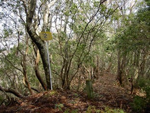 北東へ尾根を登るとCa620mのコブ。コンクリートの石柱とともに黄色地の「No.2」標識が立っていた。