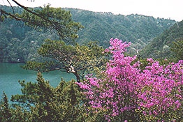 大岩ガ岳から望む羽束山 ゴールデンウィークの始まり、4月下旬は ヤマツツジが満開。新緑で山は白く見えます。 手前は千刈水源池。 1996.4.28. |