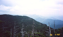 ■目的地:弥山(1895m)・八経ヶ岳(1914.9m) ■日にち:1997年7月20日(日) ■天気:晴れ時々曇り ■同行者:あきゆきさんご夫妻、佐竹さん ■コースタイム: 自宅発(4:50)〜(名阪道)〜針IC(6:10)〜トンネル西口着(8:20) トンネル西口発(8:30)〜奥駈出合(9:10-9:20)〜弁天の森(9:35)〜 聖宝ノ宿(10:10)〜弥山小屋(10:55-11:10)〜八剣山(八経ヶ岳)(11:50-12:30)〜 弥山小屋(12:50)〜国見八方覗(12:55-13:15)〜聖宝ノ宿(13:40-13:55)〜 奥駈出合(14:35-14:40)〜トンネル西口上の沢(15:05-15:20)〜西口着(15:25) トンネル西口発(15:40)〜自宅着(19:30) 【吉野路】 4:20起床。寝過ごすかと思っていたが、目覚ましより先に起きた。 朝焼けの空を1週間前にも出かけた吉野路へ向かう。R169に入り伯母谷あたりまで 順調。夏休みのせいか車が増えてきた。新伯母峠トンネルの手前の片側通行で 3回待ち。それでも今日は余裕の時間。行者還林道から見上げる尾根に懐の深い 大峰を感じる。林道途中で自転車組5・6人休憩中。この辺りは工事で7/22〜8/10 通行止めと看板が出ている。7/14に通った時はなかったので、運がよかった。 何とか出発10分前にトンネル西口に到着。すでに、皆さんお待ちかね。少し下に 停めるところを確保頂いていたのでスムーズに駐車。ありがとうございます。 【シャクナゲの森】 テントもいくつかあって賑わう西口から木の橋を登り、谷沿いに 歩くと綺麗な沢を渡る。ここから約300m位の急登が始まる。大きなブナか何かの目立つ 森の中をよっこら登る。長い登りであるが、緑の映える涼しい森の中は気持ちがいい。 半分くらい登った辺りでシャクナゲの木が目立つ。花の時期には素晴らしかろう。 かなりの間シャクナゲが続いて、背中に稲村ヶ岳を見るようになると奥駈出合である。 【ショウキランの森】 ここまで来れば後は楽勝。(^^)v 「うーん、あとは弥山の 手前かなぁ。」とあきゆきさん。そこが「聖宝八丁」と呼ばれる行者泣かせの急登と知ったのは 帰ってガイドブックを読み返した時だった。(^^;; 奥駈道はひと抱え以上ある大きな木が立ち並び、苔むした倒木が点在する林の中の尾根道。 「さぁ、ここからは皆さん撮りたい時に適当にやって下さいよぉ。」とあきゆきさん。 しかし、バイケイソウの緑っぽい花は有れどそれ以外はめぼしいものがない。 弁天の森の手前だったか、朽ちた木の影に淡いピンクの花、ショウキラン発見。 初めて見る。撮影モードのあきゆきさんと佐竹さんを置いて、芳子さんとゆっくり 先に行く。そうすると、またまたショウキラン。こっちは数本出ている。後から来る 二人に知らせるため待っていると、あきゆきさんがちゃんと気がつきはった。 やがて前方に大きな山がこにんもり姿を現す。弥山だ。聖宝ノ宿からは道が二つあるらし くて、あきゆきさんが先頭で案内していただく。 【トウヒの森】 くねくねとトウヒの目立ってきた急登を登る。大普賢や山上ヶ岳 方面が立ち枯れたトウヒの間から覗く。「手前が鉄山で、その奥がバリ小屋の頭。」 うーん、大きい。 黙々と登っていくと、頭上から唸り音が聞こえてくる。ずっと鳥の声だけだったのに ここへ来て何だろう、無線中継所かなととぼけたことを考えていると、弥山小屋である。 数人が昼食中。バイケイソウも満開。ここから弥山山頂へは5分ほどで着く。 神社(天川神社奥宮)があって、森に囲まれ展望なし。御神酒を持ってきている人もいるようだ。 小屋へ戻る途中で南に三角形の八剣山(八経ヶ岳)が姿を現す。近畿の最高峰だ。 緑をバックにトウヒが白い縦の線を入れている。 国見八方覗に行ってみると林が開けて大台方面を望む。ピクニック気分になれる 芝生のような、なかなかいい所である。ここでも数人が昼食。あぁ、腹減った。【オオヤマレンゲの森】 お昼は八剣山でということで、トウヒの原生林を下りていく。 一ヶ所崖崩れのようになっていた所を過ぎると、ゆっくりとした登りになる。 ありましたよ、天女花。時期が遅くてだめかなと思っていたら、3つほど咲いている。 シカよけの柵があり、扉を開いて入るとポツリポツリと...、いやいやわんさかわんさか。 白い大らかな花がほっ、ほっと開いている。ツボミもまだある。 サスガに天然記念物指定地だ。群落とはこのことを言うんだなぁ。 各人、撮影モードで、八剣山山頂へ。昼食。大台方面の展望がよい。南側はどうかなと 少し行くが、トウヒの森で展望はいまひとつ。山頂へ戻って眼下の谷を見る。深い谷。深い山。 蒼い。国見八方覗に戻って、恒例?のあきゆきさんの冷凍ミカンをいただいた。冷たいのが なんとも言えず元気になる。ここでゆっくり昼寝もいいなぁ。 【行者さんの森】 怪しい雲が南に出てきているのでそろそろ下りる。長い下り。 聖宝ノ宿で一息。またまたあきゆきさんからオレンジをいただく。食べ終わった頃に さっきからほうほうと声が聞こえていた行者さんの一団が到着。休憩モードの合図か、 法螺貝が吹かれる。これも初めて見る。60名位。中には、登山者