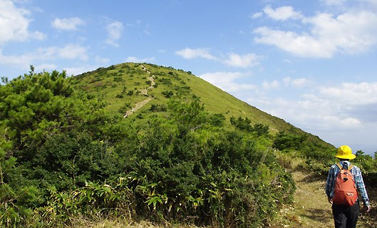 二つ目のコブを越えると、鍋塚が緑のお椀を伏せたようにすっくとそびえる。