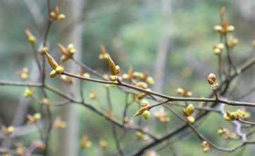 近づいてみるとマンサクの花。なかなか壮観だ。穂高湖の周遊路を東から周り杣谷峠下の