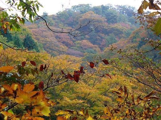 尾根が枝の間から見える。黄葉の波がうねうねと上っている。ブナが多くなる谷の上部にさしかかると