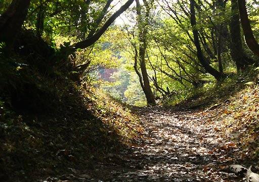 歩きやすい石積みの平坦道は紅葉のトンネル。その先のカーブに炭屋道分岐がありました。