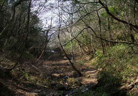 植林を下って岩の目立つ明るい沢を渡る。木の階段もあるコブを登り返して地蔵谷のコースに出合う。ここは