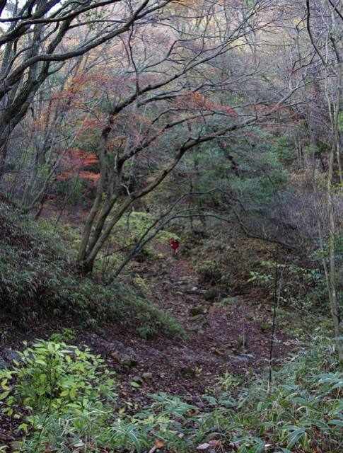急な登りを過ぎて沢を渡る所は名残の紅葉が赤かった。思いの外の長い登りに彼女はうんざり気味。