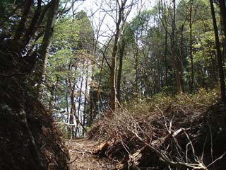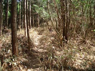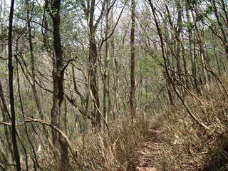 仕事道が分岐するが道標には×印。続いて急傾斜の雑木林の谷。尾根の東側を行くようになる。