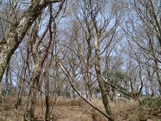 山並みが見える。植林が右手に迫る中を過ぎるとなだらかな庭園のような疎林の尾根を行く。