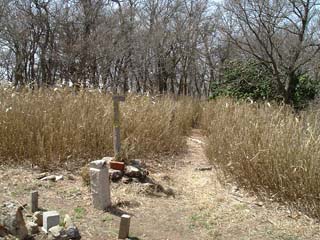 薬師峠への道標が掛かっていた。10分ほど登ると林道の小広い所の先、植林の影にまた小屋が