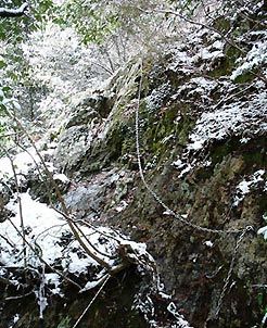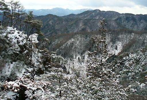 岩を登ると見晴し良く、しばし冬の眺めを堪能。左の崖は墨絵のようです。開けた谷の先には弥十郎や