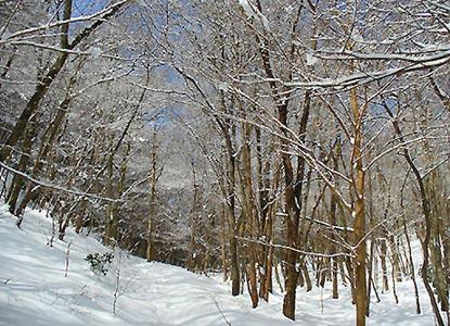雑木の中を緩く登れば、本来の目的地である緩くて広い谷に到着。疎林の広場は白い絨毯です。