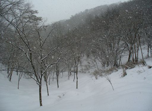 616m山の南面、萱やイバラで荒れた林道を東進していると、雪が深々と降りだします。