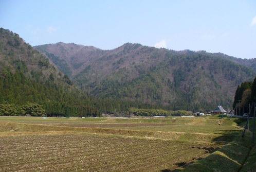 茅葺きの里駐車場はまだ10台程度。支度をして北谷林道へ向かう。田起こし前の田原越しに