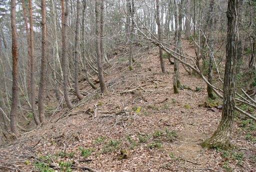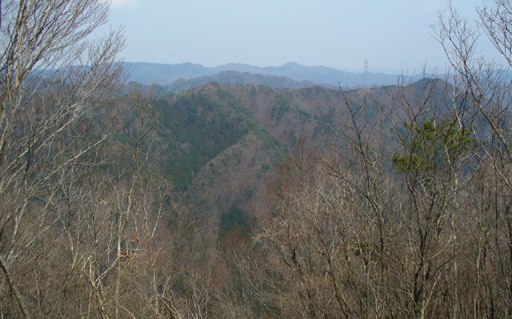 沢から高く離れ、水のない谷を詰めて尾根上の峠にのる。周りは雑木林。その木々の先に山影遙か。