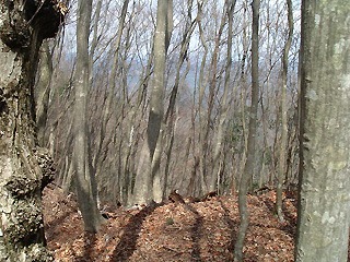 急登のザレた谷を延々と登りました。高度が上がるとまだ芽の小さい枝越しに深山